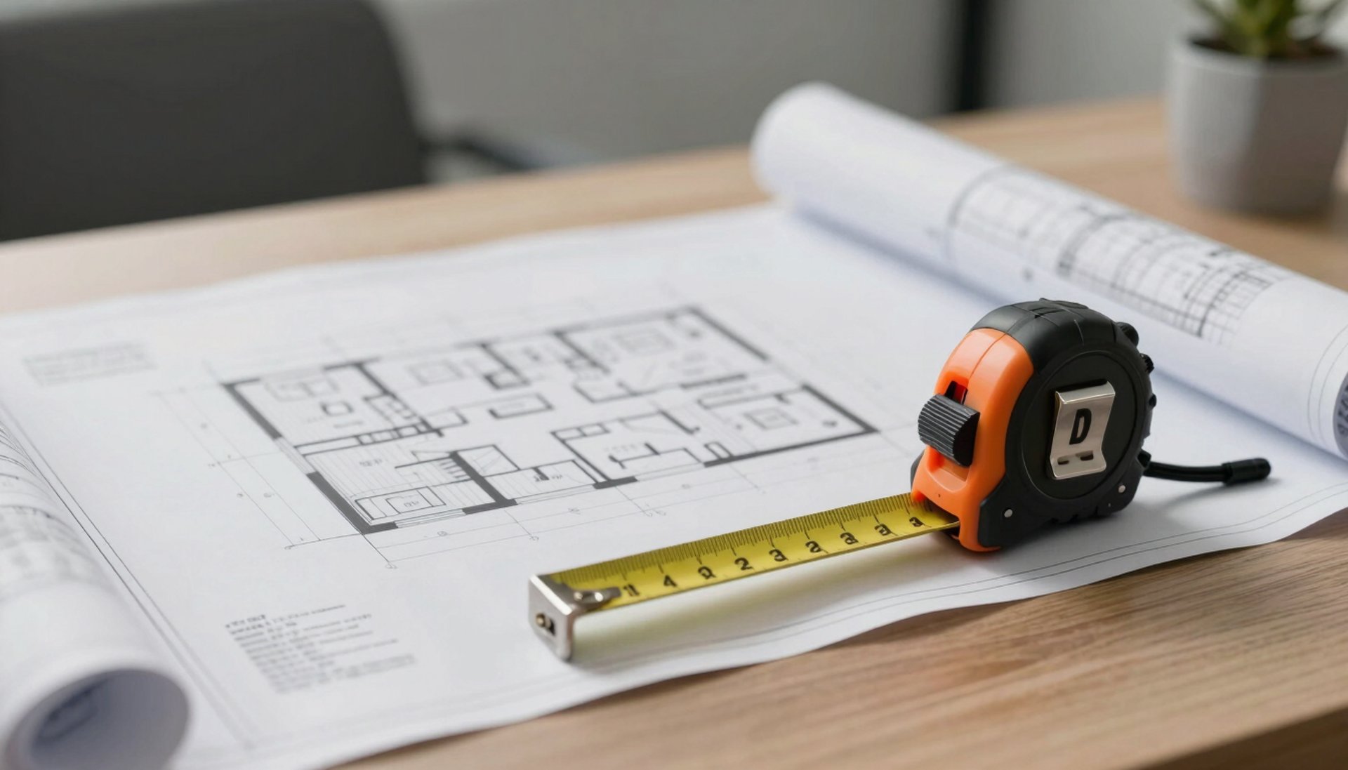 Close-up of a worker in professional construction attire measuring a basement renovation space, focusing on precision and craftsmanship, modern light grey aesthetic.
